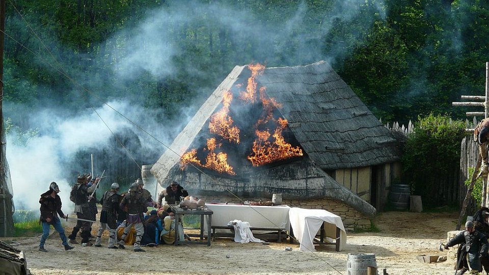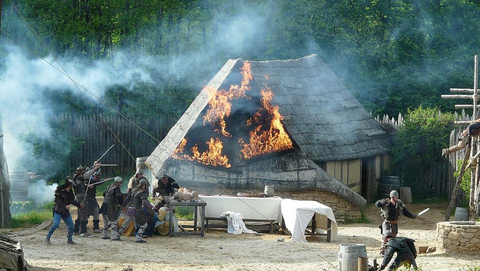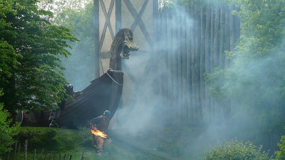 5 Surgissant de leurs drakkars au milieu des flammes gigantesques, les féroces vikings attaquent le paisible Fort de l'An Mil aux toits de chaume. |