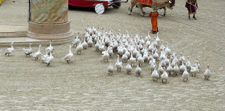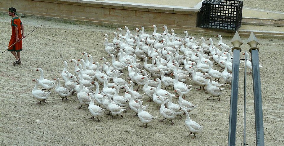 34 in summum saxum evaserunt tanto silentio ut non solum custodes fallerent, sed ne canes quidem, sollicitum animal, excitarent. Anseres non fefellere, quibus in summa inopia Romani abstinuerant, quia aves erant Junoni sacrae ; quae res Romanis saluti fuit. : ainsi raconte la légende