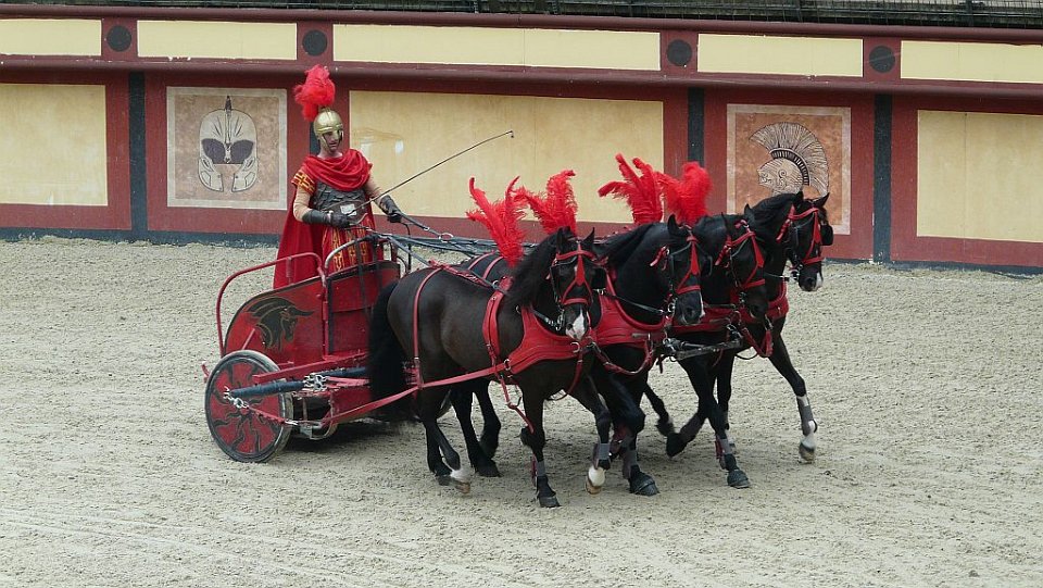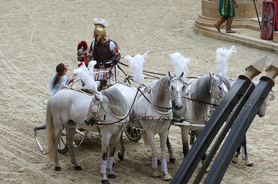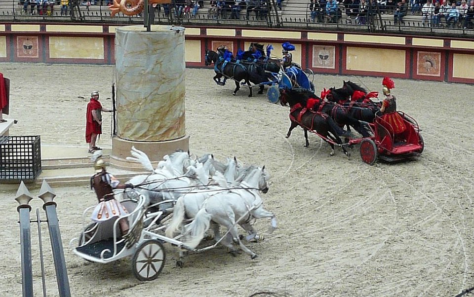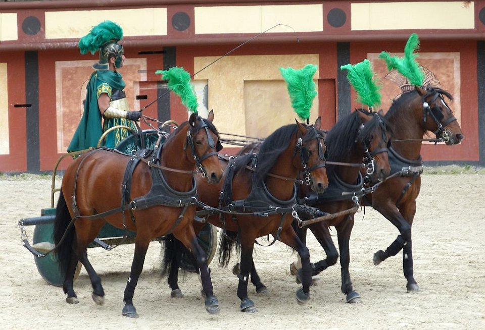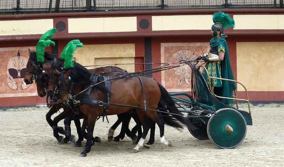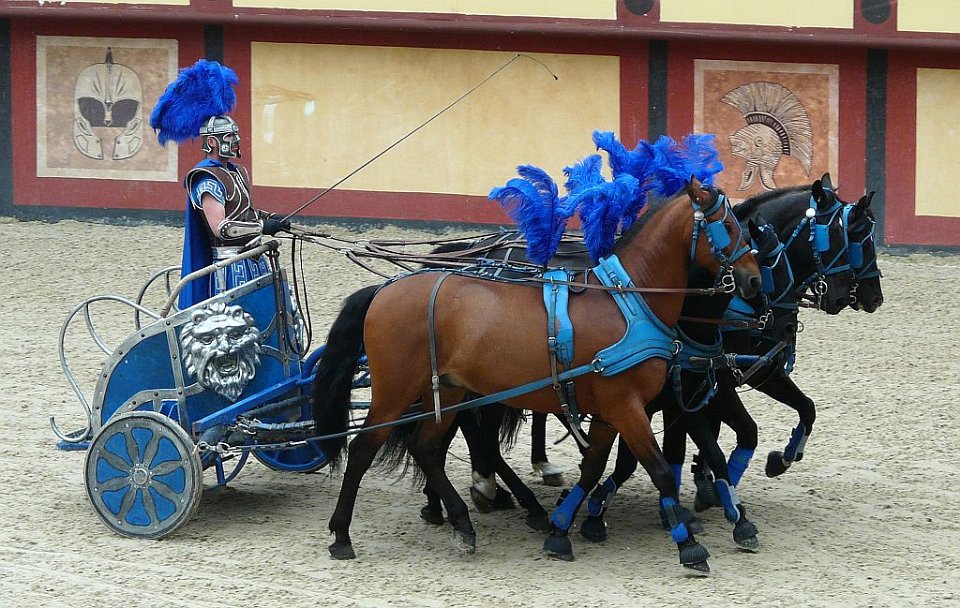 76 Les graves blessures et quelquefois la mort que ces courses pouvaient entraîner pour les participants donnaient à l'épreuve une dimension spectaculaire qui contribua à son succès auprès du public. Chaque char était tiré par un, deux (bige, originellement un jeu étrusque), trois (trige), quatre (quadrige) ou six chevaux. Les chars de compétition étaient conduits par des auriges