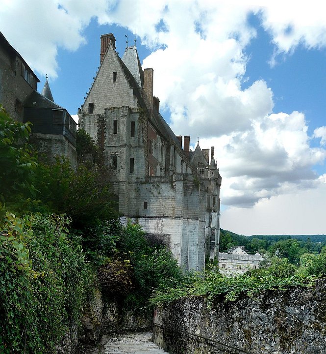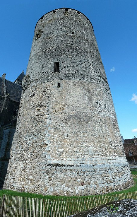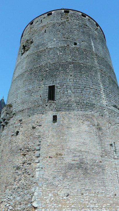 20 enfin droit.Le donjon cylindrique, haut de 31 m sous toiture et de 42 m au total 2 et ayant 17 m de diamètre a été édifié en 1180. Doté de murs épais de 4 mètres, il comporte trois niveaux : le rez-de-chaussée accessible uniquement de l'étage supérieur par un puits était utilisé pour le stockage des vitres. Le toit en ardoise reposant sur une charpente fortement dimensionnée a été ajoutée par Dunois. L'accès au donjon se faisait initialement par une porte située initialement à 10 mètres de hauteur qui communique aujourd'hui avec les combles de la chapelle.