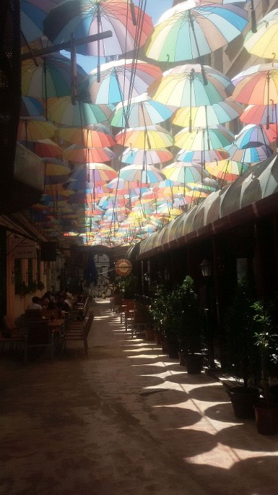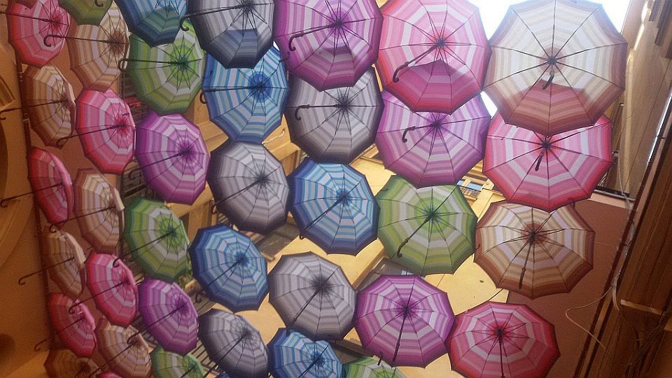 19 Umbreallas formait le toit des cafés dans Pasaj Victoriei,(ML)