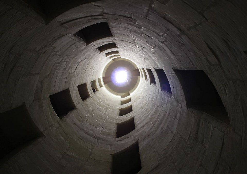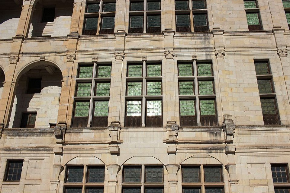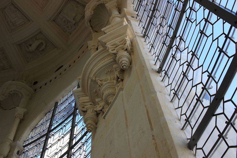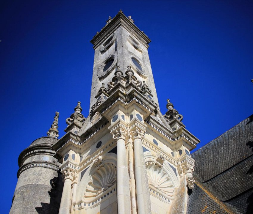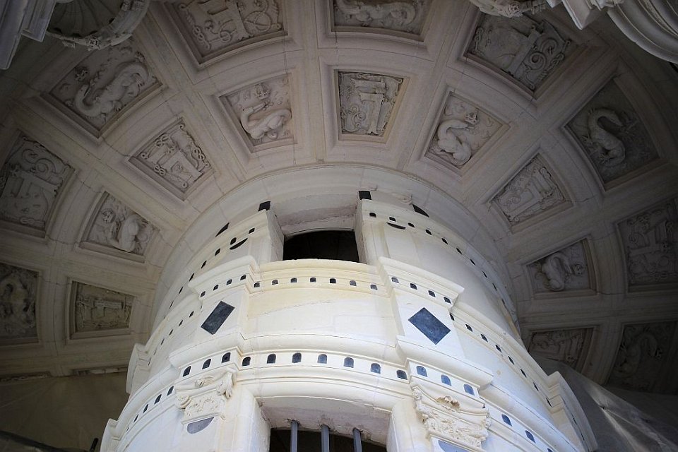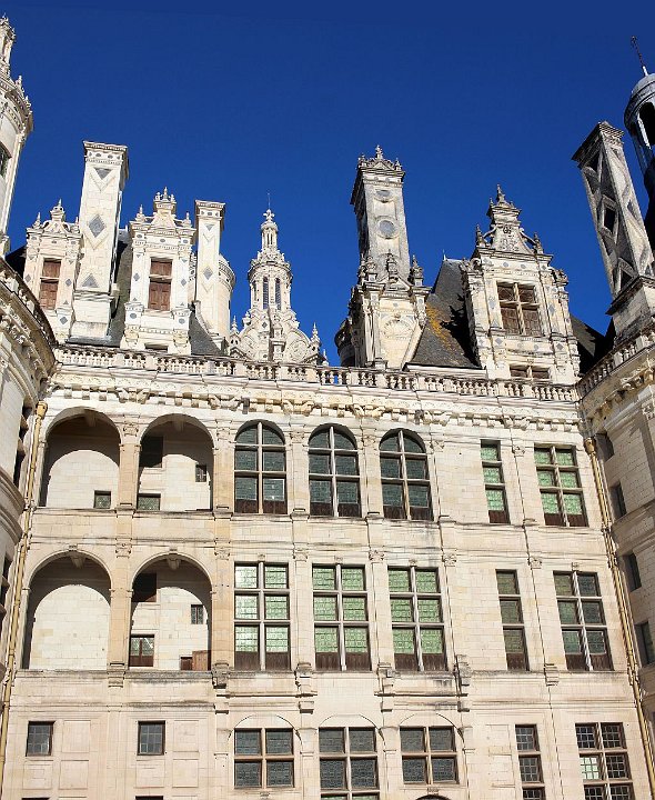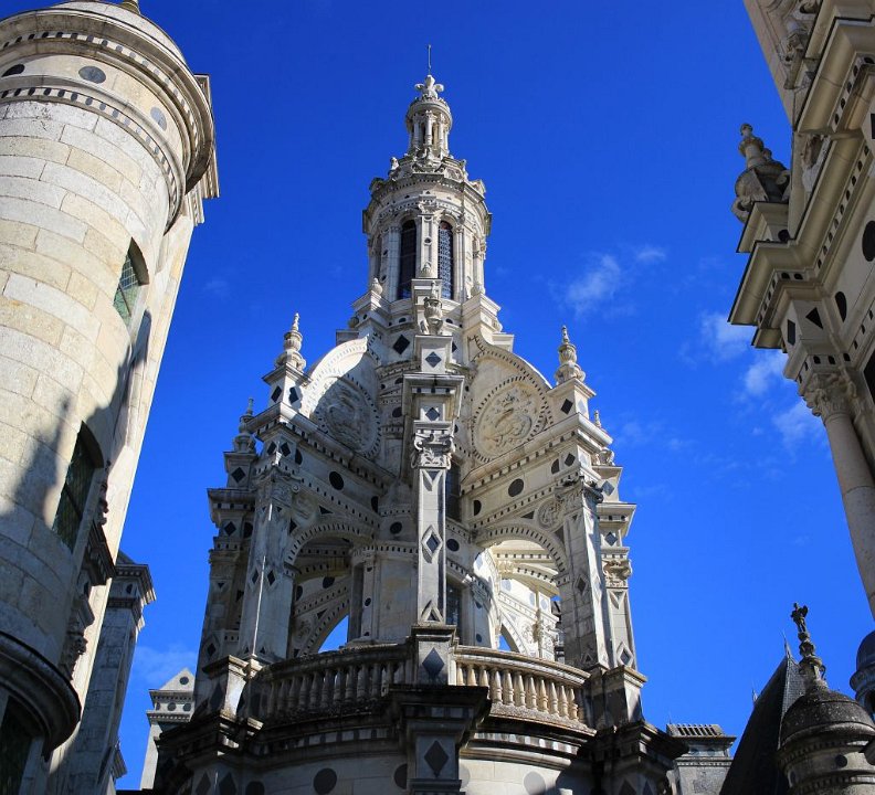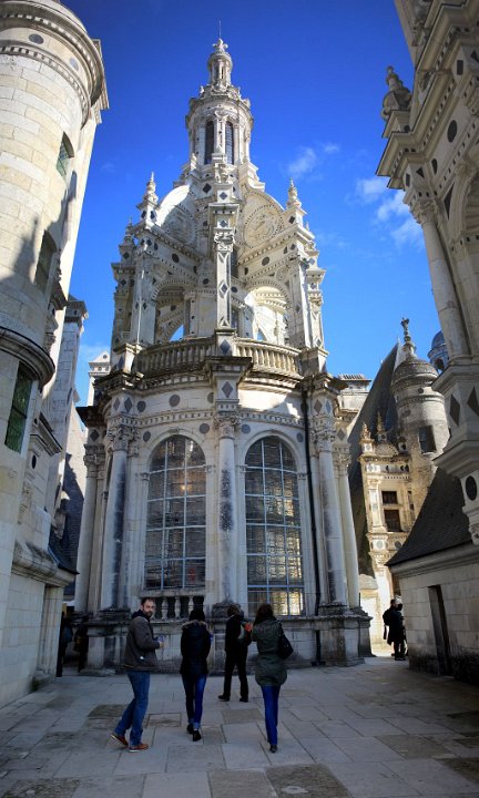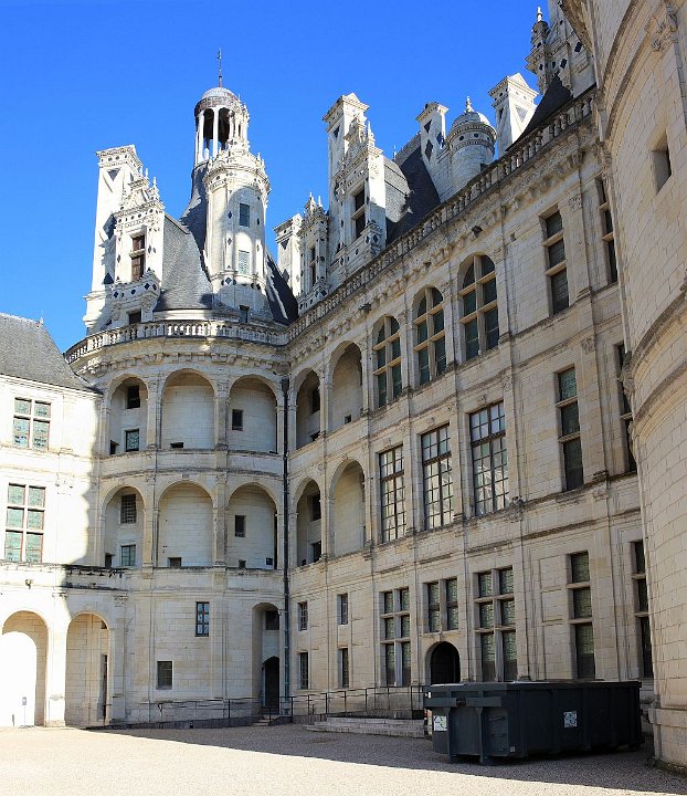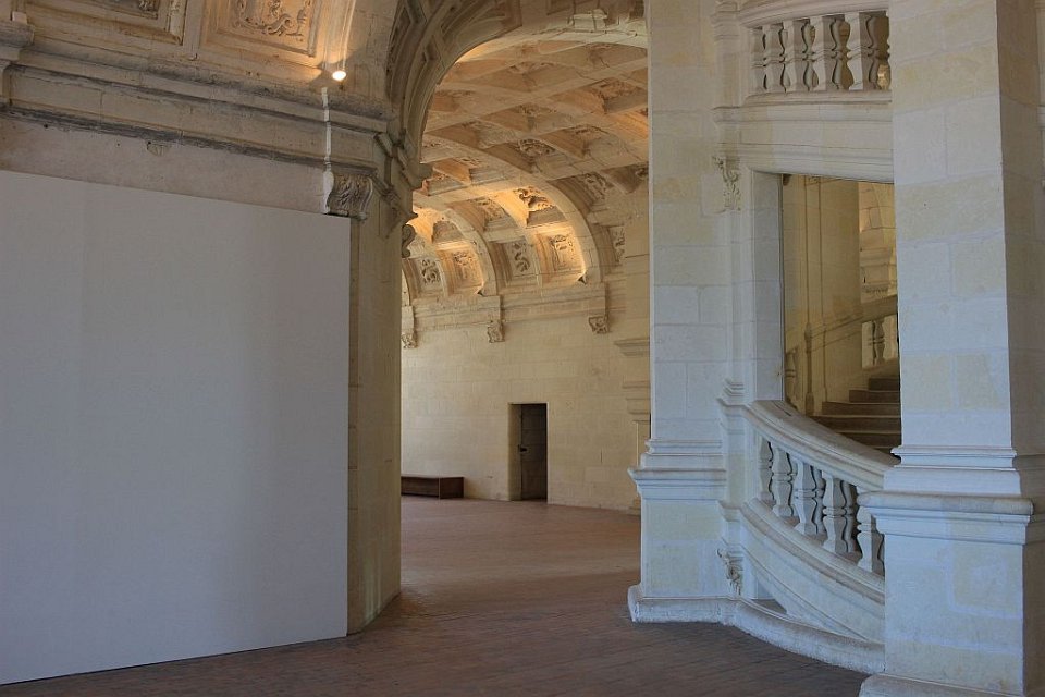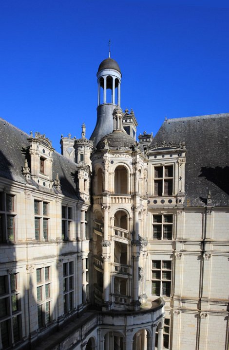 33 Il se compose de deux rampes jumelles hélicoïdales s’enroulant l’une au-dessus de l’autre autour d’un noyau creux et ajouré. Cet escalier dit « à doubles révolutions » dessert les étages principaux de l’édifice, jusqu’aux terrasses sommitales où il est surmonté par la plus haute tour du château, la tour-lanterne.