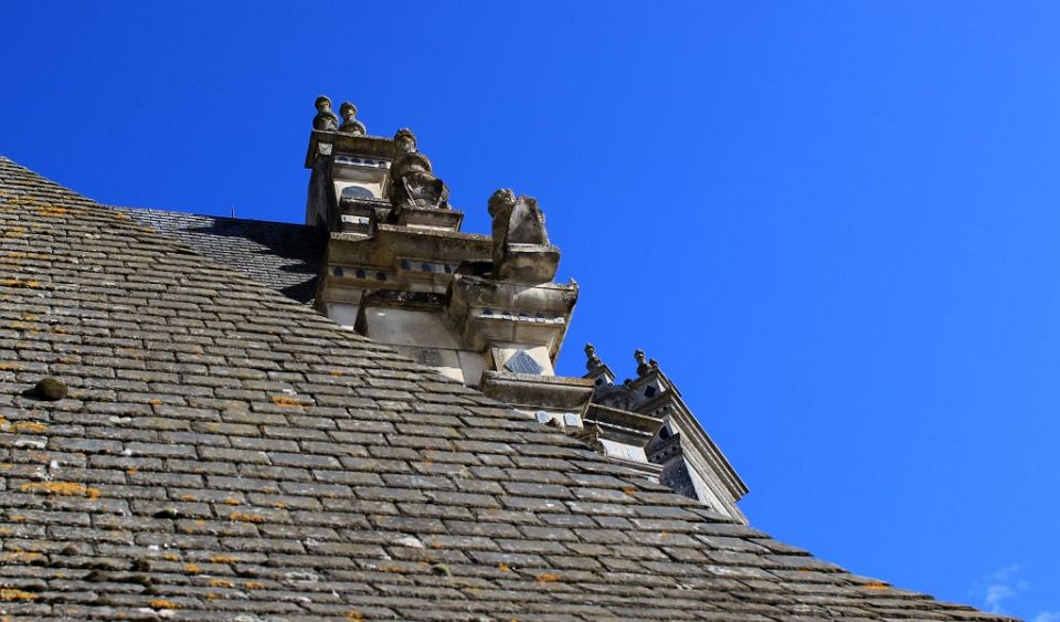 4 Symétie en trompe l'oeil , recouverte de cheminées , de tourelles, mariant la pierre et l'ardoise.