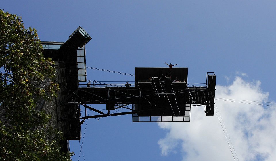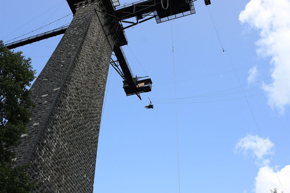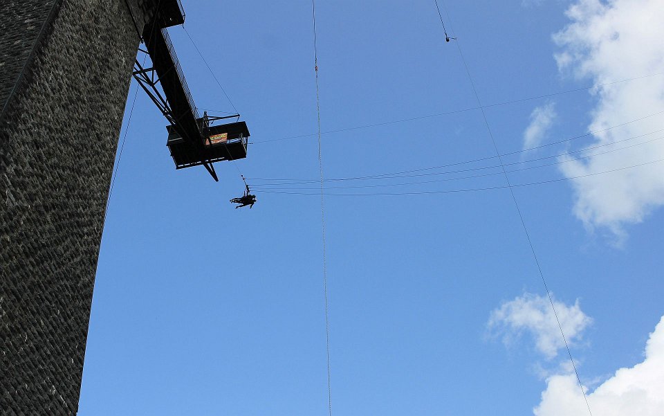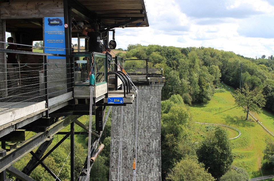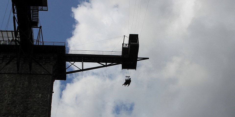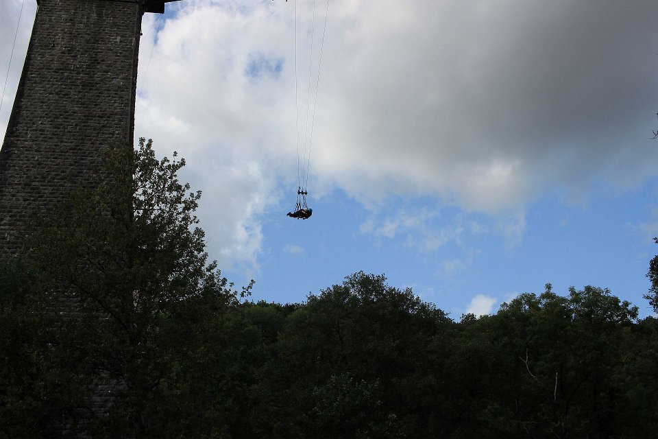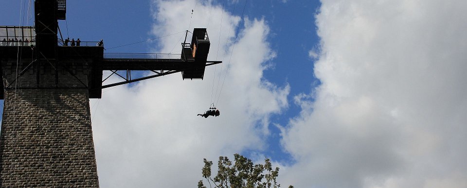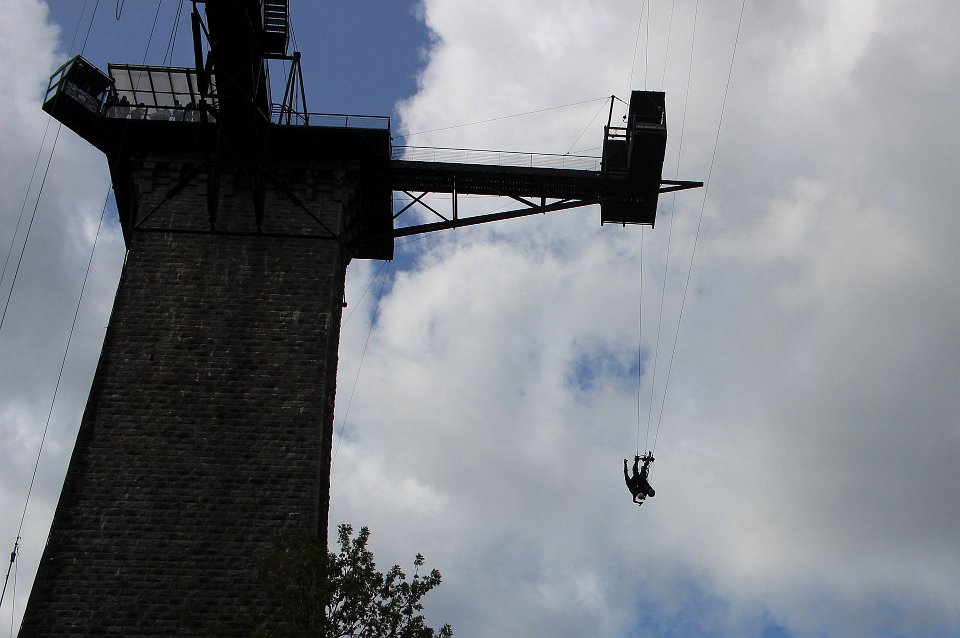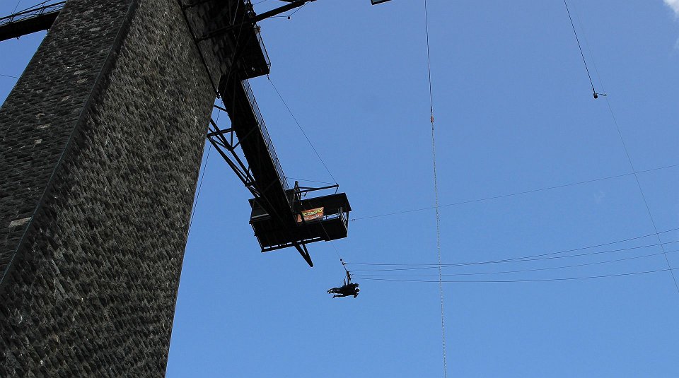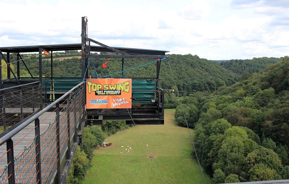 34 Le saut pendulaire extrême, dit "Top Swing", ajouté en 2009, partant cette fois depuis les 61 mètres du haut du viaduc, atteignant 130 km/h en 3,5 secondes sur un arc de 150 mètres.Au bout de la passerelle , on a déjà l'impression de flotter.