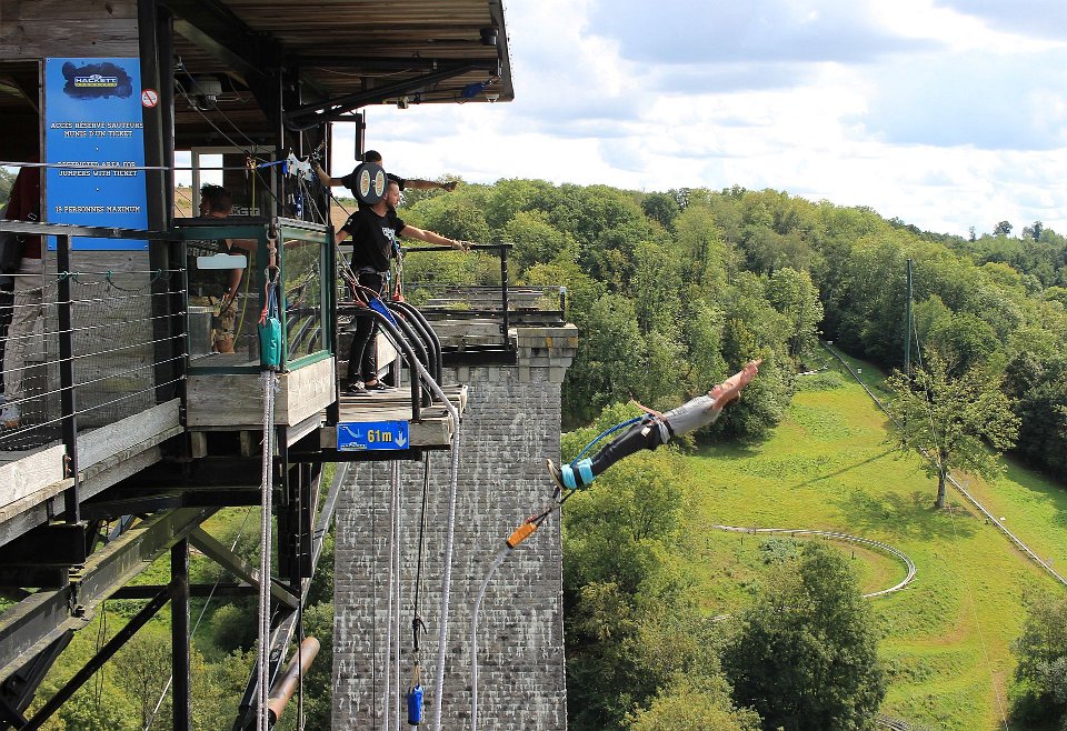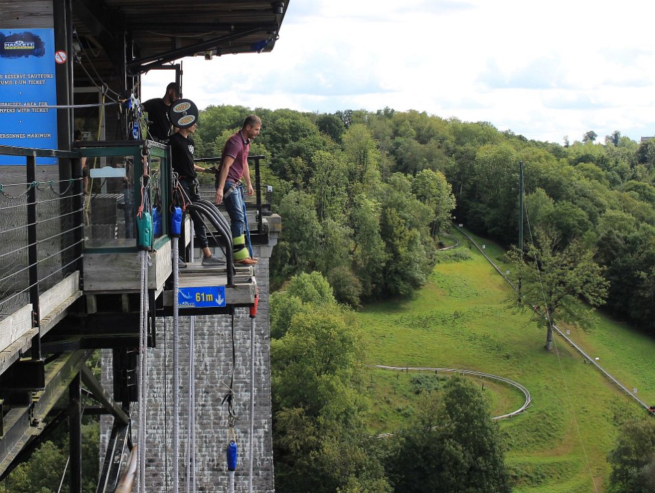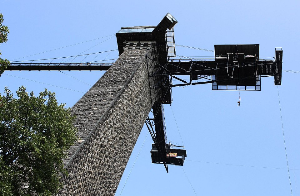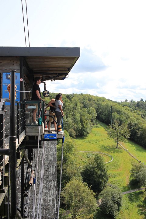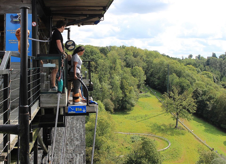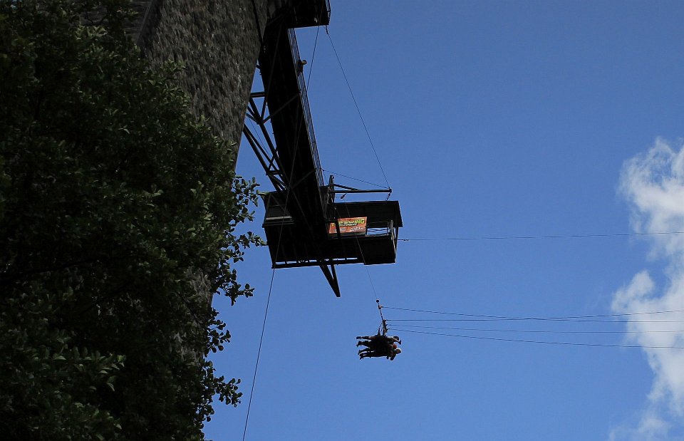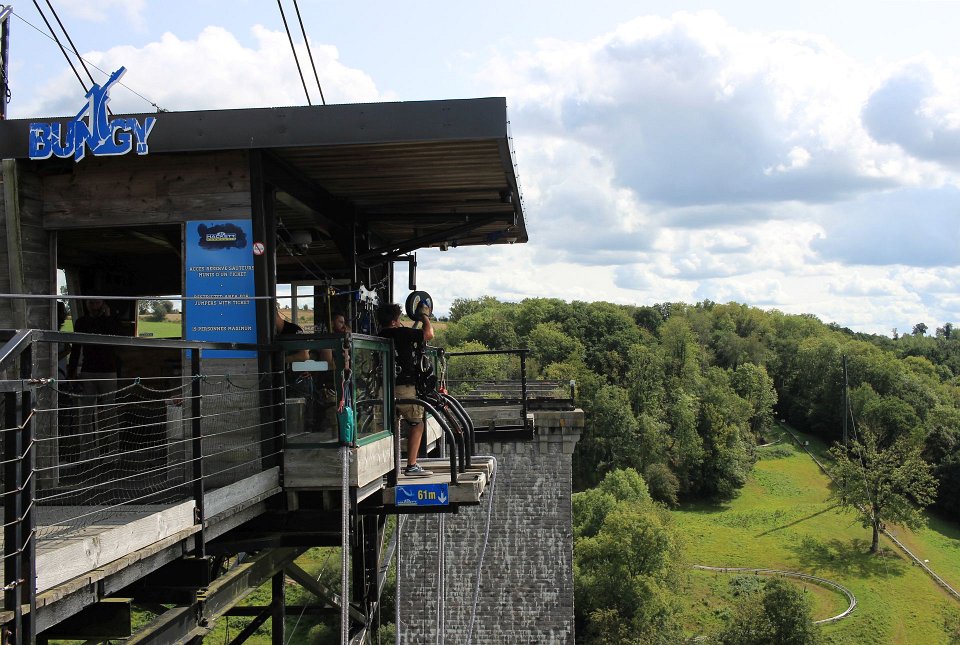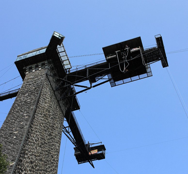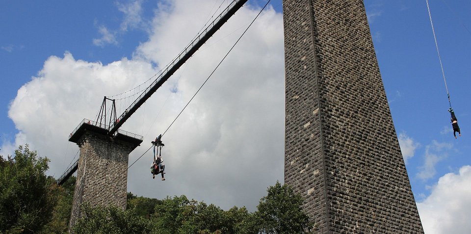 34 Le saut pendulaire extrême, dit "Top Swing", ajouté en 2009, partant cette fois depuis les 61 mètres du haut du viaduc, atteignant 130 km/h en 3,5 secondes sur un arc de 150 mètres.Au bout de la passerelle , on a déjà l'impression de flotter.