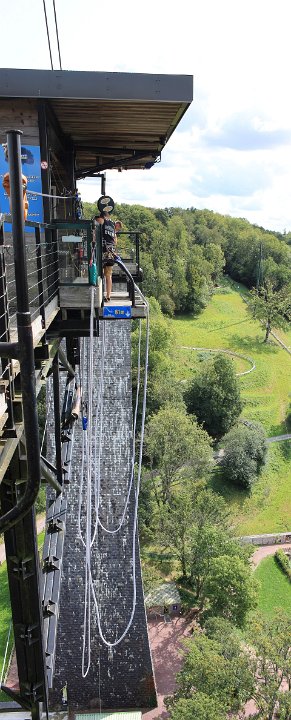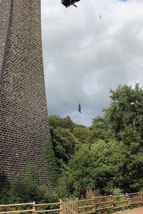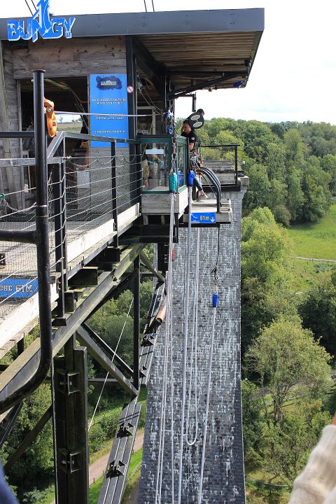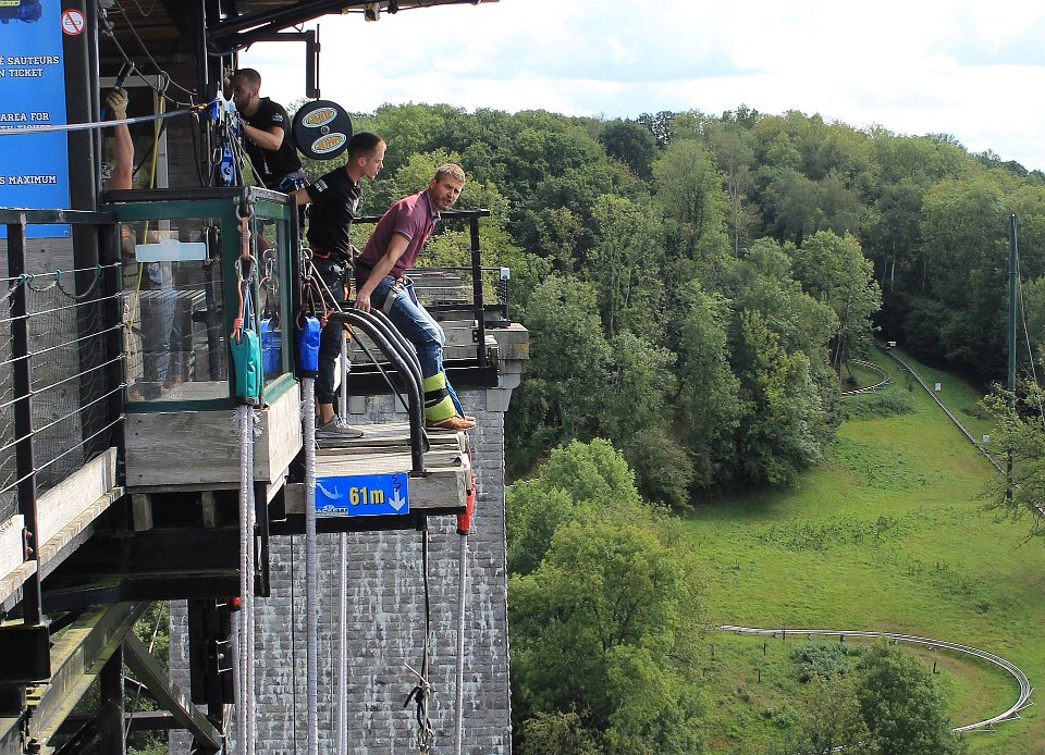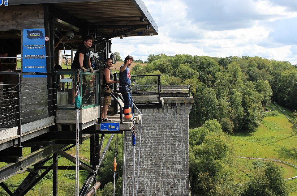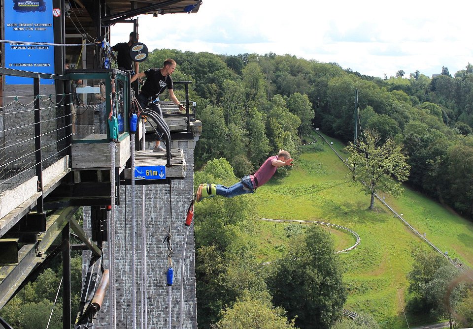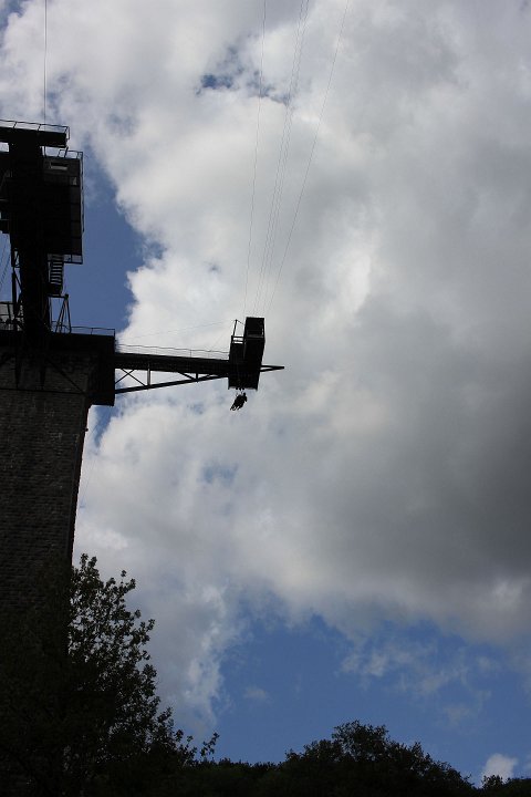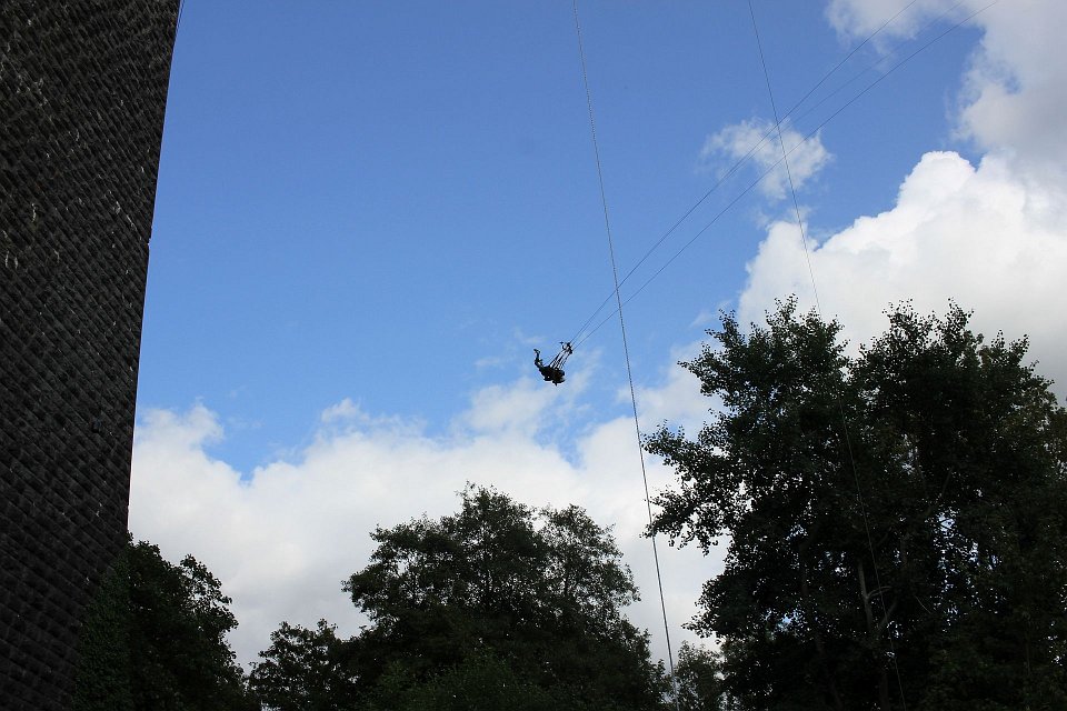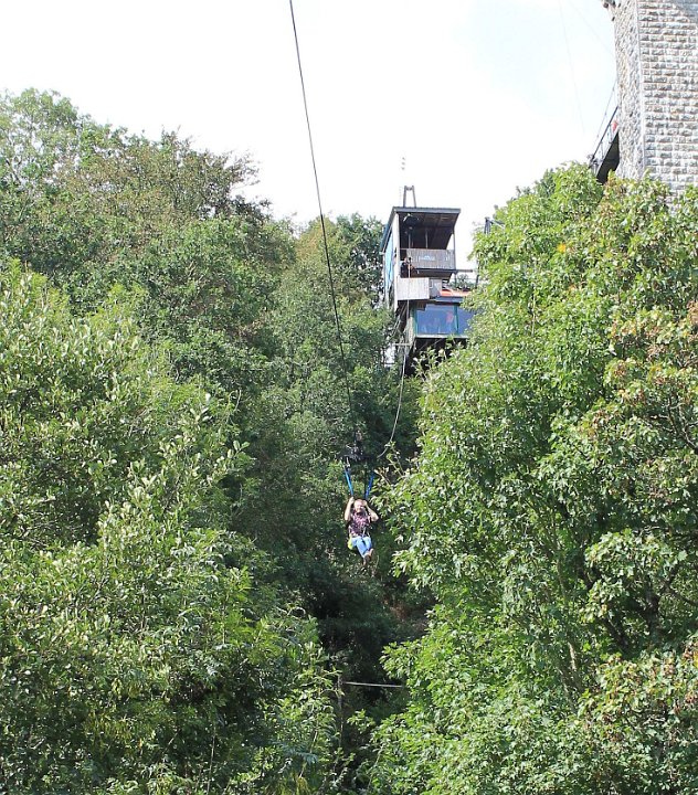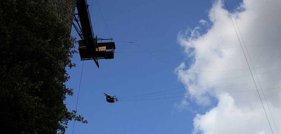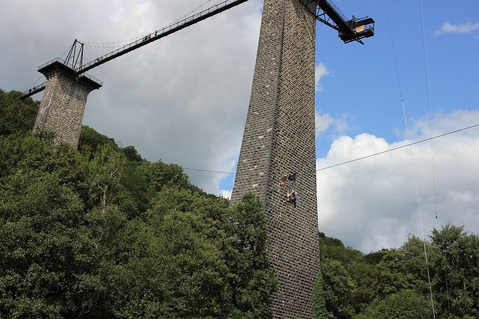 34 Le saut pendulaire extrême, dit "Top Swing", ajouté en 2009, partant cette fois depuis les 61 mètres du haut du viaduc, atteignant 130 km/h en 3,5 secondes sur un arc de 150 mètres.Au bout de la passerelle , on a déjà l'impression de flotter.