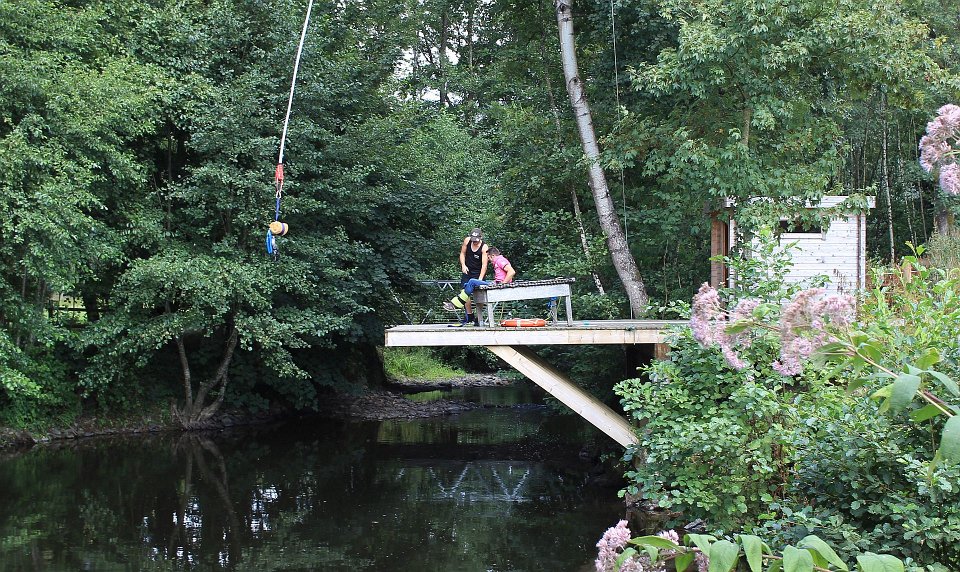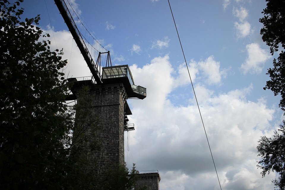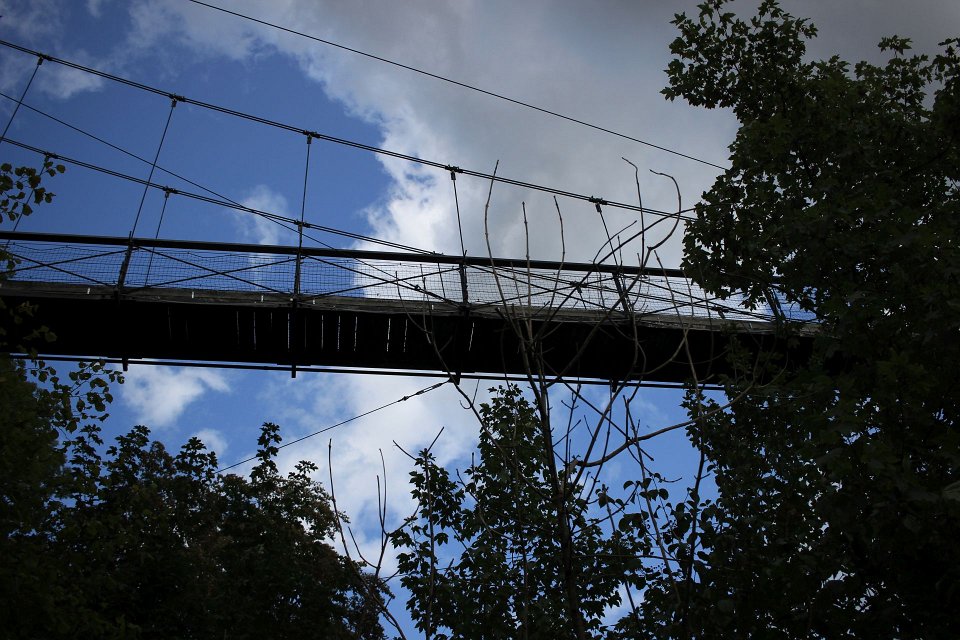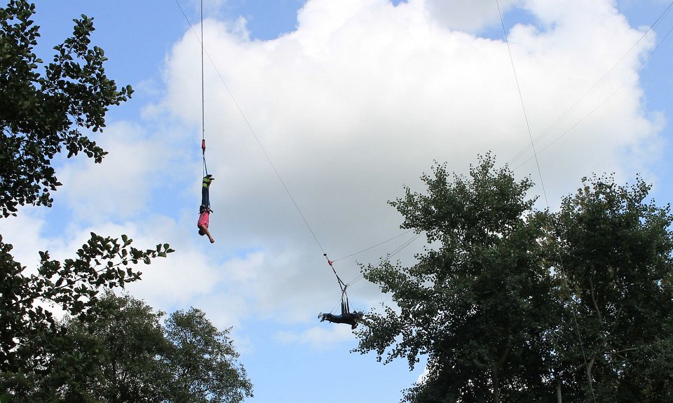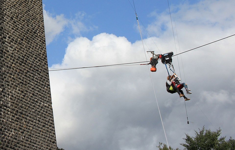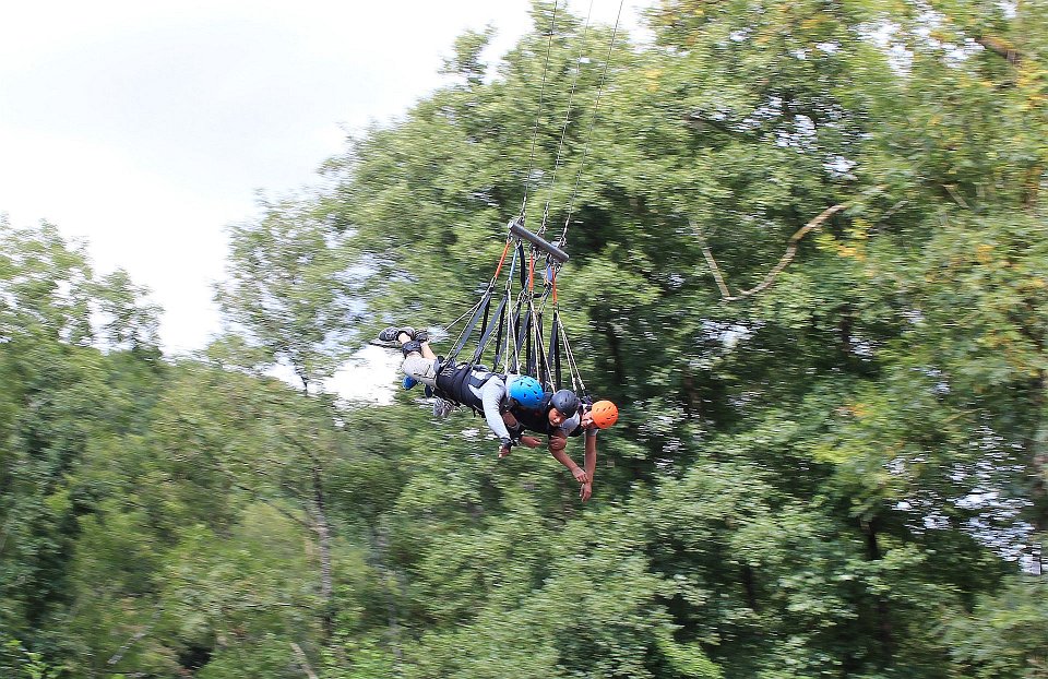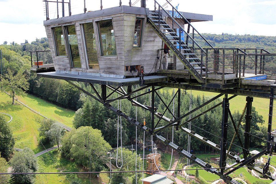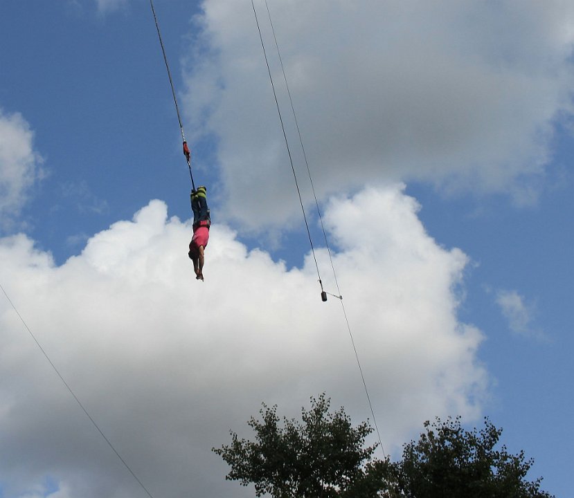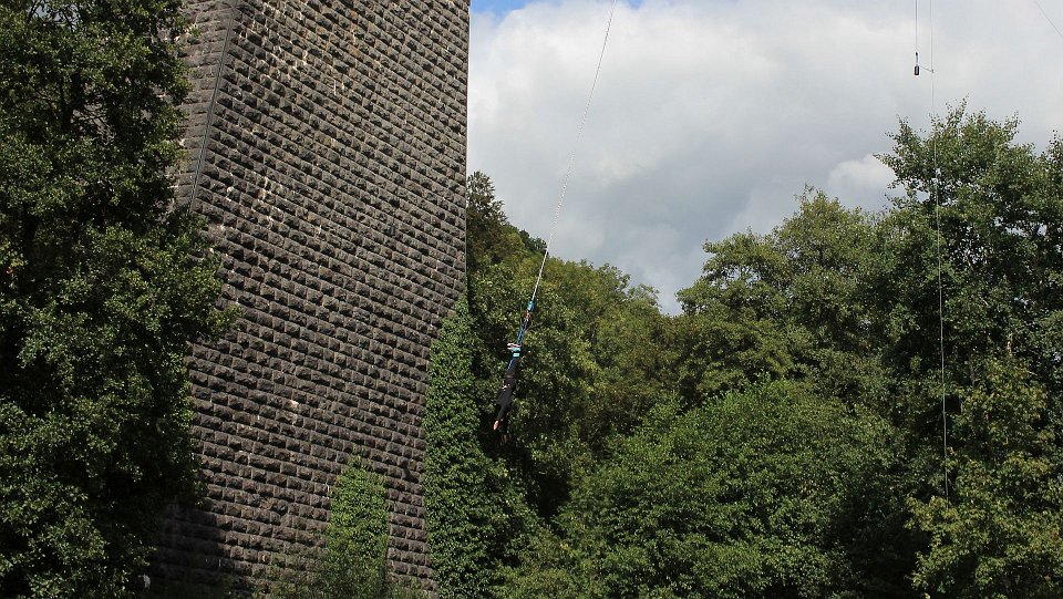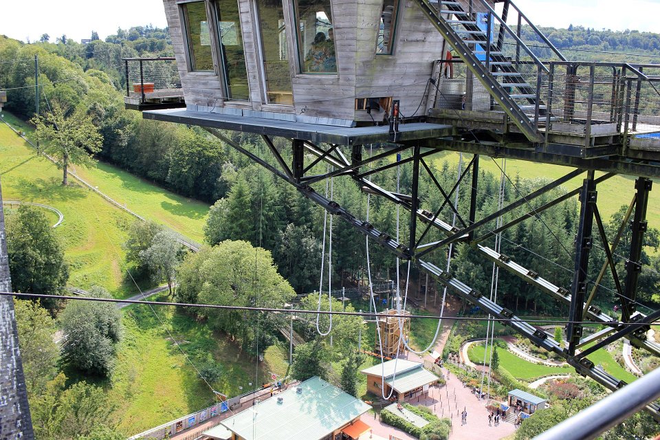 34 Le saut pendulaire extrême, dit "Top Swing", ajouté en 2009, partant cette fois depuis les 61 mètres du haut du viaduc, atteignant 130 km/h en 3,5 secondes sur un arc de 150 mètres.Au bout de la passerelle , on a déjà l'impression de flotter.