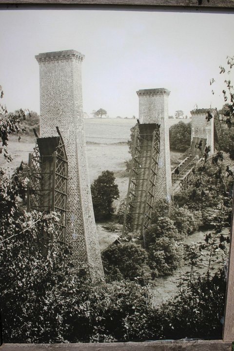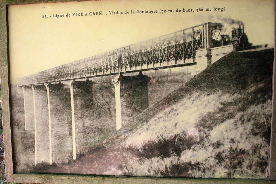 6 Le viaduc a été construit entre 1887 et 1889, selon des plans de Gustave Eiffel, pour permettre à la ligne Caen-Vire de franchir la vallée de la Souleuvre. L’ouvrage, ouvert aux voyageurs en 1891, frôle plusieurs fois la destruction pendant la Seconde Guerre mondiale. Les alliés cherchant à détruire cet axe stratégique dans un bocage bas-normand occupé larguent 500 bombes qui tombent toutes à côté, et ne font qu’endommager partiellement le tablier.Déjà à l'époque on voulait sa peau.