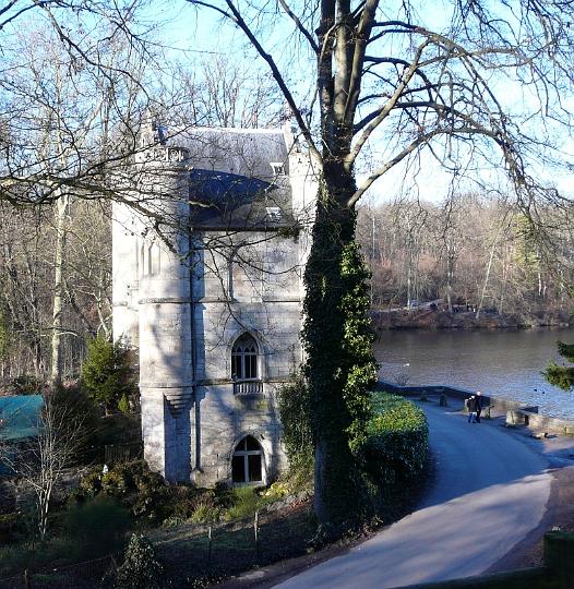 | En 1826, le moulin est supprimé, la loge réparée, et on lui donne le cachet d'un château du Moyen-Age, avec portes et fenêtres ogivales, tours crénelées. | |