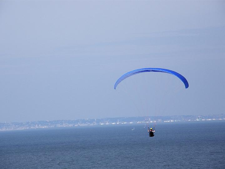 | Une voile bleue et la vue sur la baie de Seine. | |