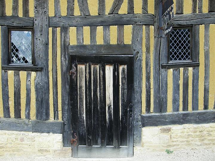 | A l'origine, l'extrémité (côté cheminée) est réservée à l'habitat du fermier. L'autre partie est occupée par des étables surmontées par un grand comble pour le stockage des fourrages. Le Corps de bâtiment est percé d'un porche constituant l'accès unique à la basse-cour. Le bâtiment est construit sur un mur solin en pierre, les étages sont en pan de bois vertical et torchis avec des grandes écharpes obliques. Entrons. | |