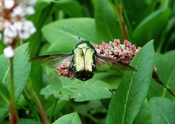 | Nous avons le plaisir d'accueillir un scarabée vert volant. | |