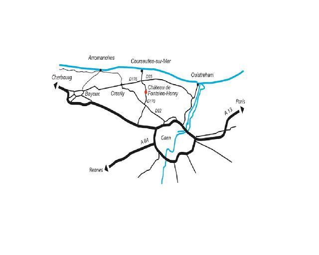 | Nous allons vous emmener à Fontaine Henry.Suivez le plan.À mi-chemin entre Caen et les plages du Débarquement, le château de Fontaine Henry surplombe la vallée de la Mue. | |