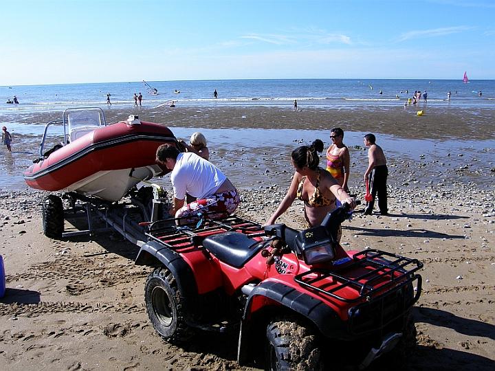 | Mais il faut alors mettre le bateau à l'eau.Le bateau est chargé sur sa remorque pour être amené à proximité de la marée qui était alors basse.Le copain "Matthieu" doit alors être musclé et en forme.Le bateau est tiré à la force des bras jusqu'à son pontet d'embarquement sur la remorque. Accroché solidement au filin, il est ensuite prêt pour le treuillage. | |