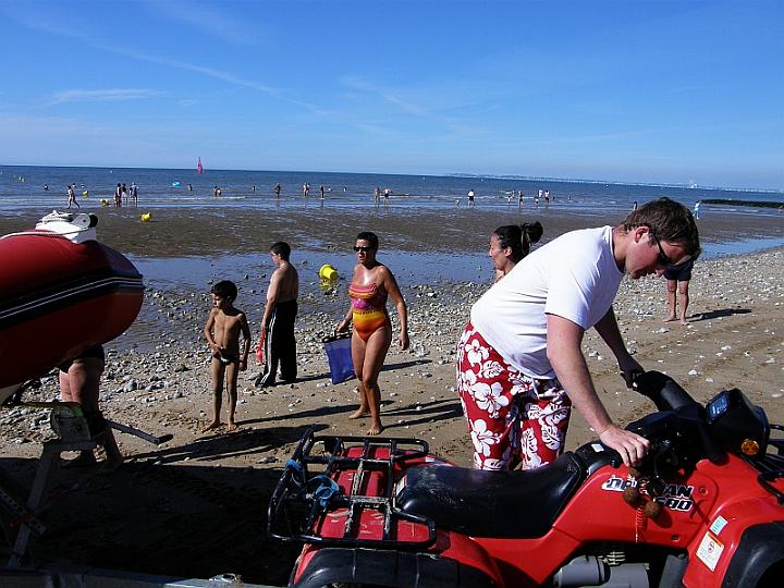 | Ensuite, c'est un jeu d'enfant de démarrer le quad rouge. Les passagers "Emma,la maman de Matthieur & Marie-georges " s'impatientent sur l'estran. | |