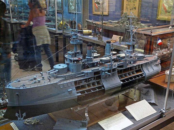 | Cuirassé IENA.Maquette en tôle chaudronnée.Le 12 mars 1907, il est victime d'une explosion dans une des soutes de munitions alors qu'il était en câle sèche à Toulon.8 officiers et 100 mâtelots trouvèrent la mort dans cette explosion qui fit de redoutables dégats dans la ville.Du fait qu'ils possédaient une artillerie lourde et de gros blindages, ils furent considérés comme les rois des mers jusqu'à la seconde guerre mondiale.Ils étaient vulnérables pendant la révision.... | |